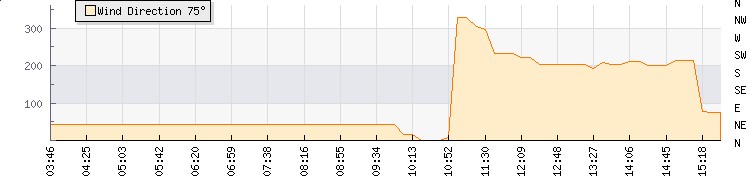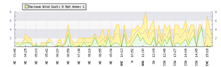 In the last few minutes the wind was South South West at an average speed of 3 mph, reaching up to 5 mph and a low of 1 mph. The gust strength is4 mph above the minimum speed |