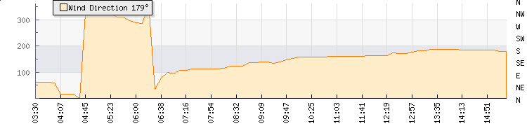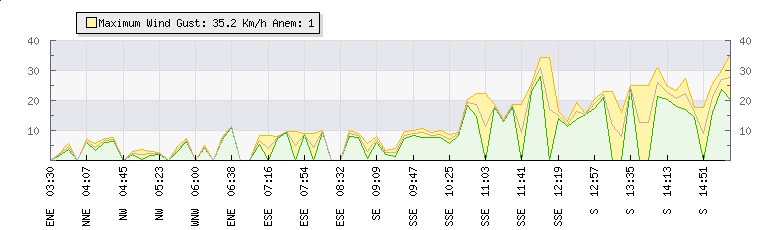 In the last few minutes the wind was Southerly at an average speed of 19 kmh, reaching up to 21 kmh and a low of 17 kmh. The gust strength is4 kmh above the minimum speed |