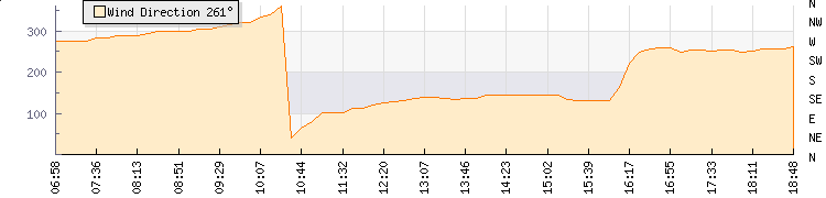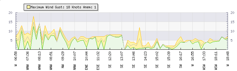 In the last few minutes the wind was West South West at an average speed of 5 knots, reaching up to 6 knots and a low of 4 knots. The gust strength is2 knots above the minimum speed |