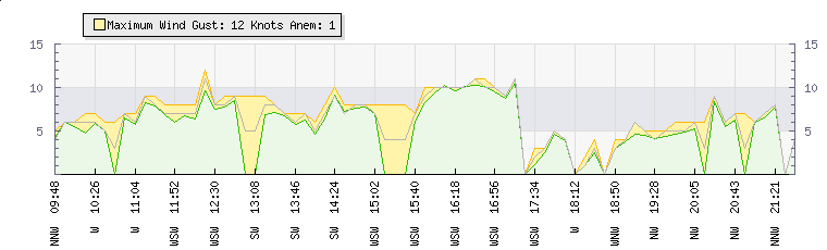 In the last few minutes the wind was South Westerly at an average speed of 6 knots, reaching up to 6 knots and a low of 5 knots. The gust strength is1 knots above the minimum speed |