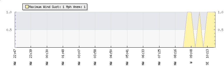 In the last few minutes the wind was Westerly at an average speed of 1 mph, reaching up to 1 mph and a low of 0 mph. The gust strength is1 mph above the minimum speed |
