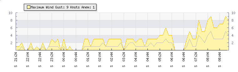 In the last few minutes the wind was Southerly at an average speed of 2 knots, reaching up to 3 knots and a low of 0 knots. The gust strength is3 knots above the minimum speed |