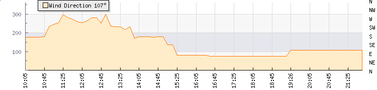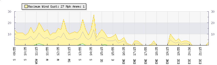 In the last few minutes the wind was West North West at an average speed of 11 mph, reaching up to 23 mph and a low of 0 mph. The gust strength is23 mph above the minimum speed |