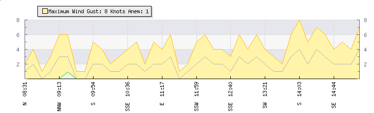 In the last few minutes the wind was Southerly at an average speed of 2 knots, reaching up to 4 knots and a low of 0 knots. The gust strength is4 knots above the minimum speed |