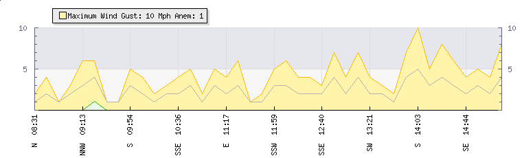 In the last few minutes the wind was Southerly at an average speed of 2 mph, reaching up to 4 mph and a low of 0 mph. The gust strength is4 mph above the minimum speed |