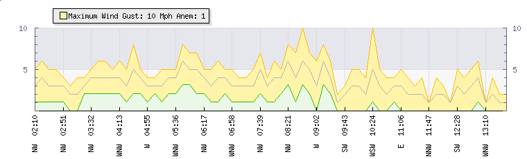 In the last few minutes the wind was West North West at an average speed of 2 mph, reaching up to 3 mph and a low of 0 mph. The gust strength is3 mph above the minimum speed |