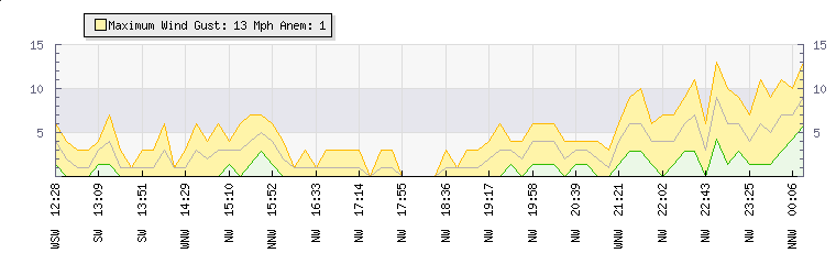 In the last few minutes the wind was North Westerly at an average speed of 3 mph, reaching up to 6 mph and a low of 0 mph. The gust strength is6 mph above the minimum speed |