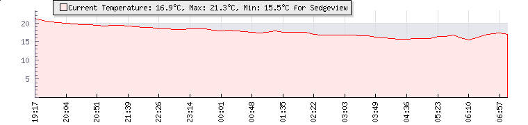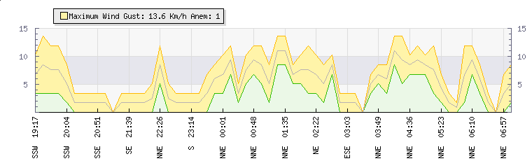 | Wind Gust: | 14 km/h | Min Temp: | 15.6 °C | Max Temp: | 18 °C | | Wind Average: | 11 km/h | Min Hum: | 88 % | Max Hum: | 92 % | |  |