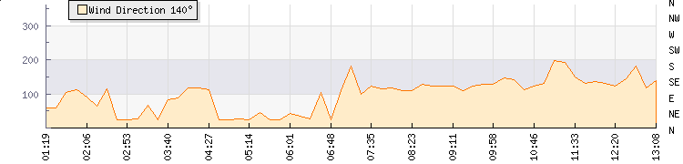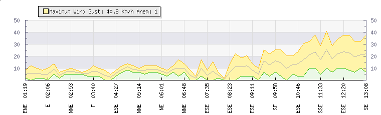 In the last few minutes the wind was East South East at an average speed of 13 kmh, reaching up to 20 kmh and a low of 5 kmh. The gust strength is15 kmh above the minimum speed |