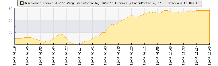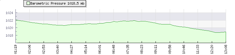 | Wind Speed: | 5|13|20 kmh | Wind Direction: | ESE 111° | Temperature: | 24.7°C | | Wet Bulb: | 18.8°C | Discomfort: | 87 | Humidity: | 57% | | Rainfall Today: | 0mm | 12 hrs Rainfall: | 0mm | 24 hrs Rainfall: | 0mm | | Barometer: | 1019.9mb | Dew Point: | 15.6°C | Clouds AGL: | 3641ft (1110 m) | | Density-Alt: | 1673ft (510 m) | Fire Danger: | |