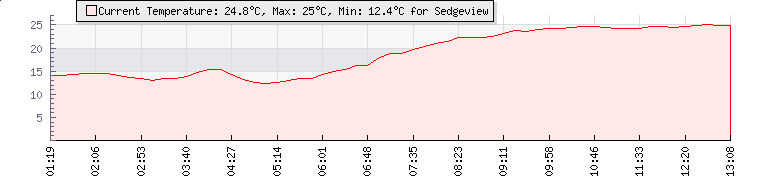 | Wind Gust: | 26 km/h | Min Temp: | 12.4 °C | Max Temp: | 24.7 °C | | Wind Average: | 16 km/h | Min Hum: | 57 % | Max Hum: | 94 % | |  |