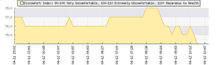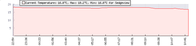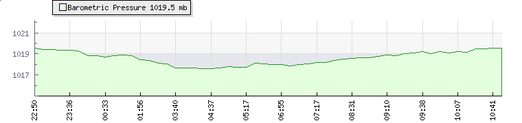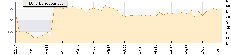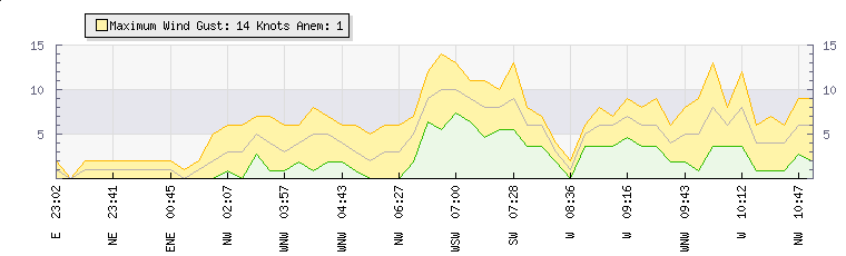 | Wind Gust: | 14 knots | Min Temp: | 17.4 °C | Max Temp: | 18 °C | | Wind Average: | 10 knots | Min Hum: | 94 % | Max Hum: | 98 % | |  |