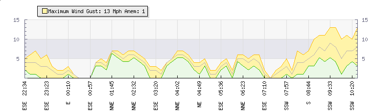 In the last few minutes the wind was South South West at an average speed of 4 mph, reaching up to 6 mph and a low of 1 mph. The gust strength is5 mph above the minimum speed |