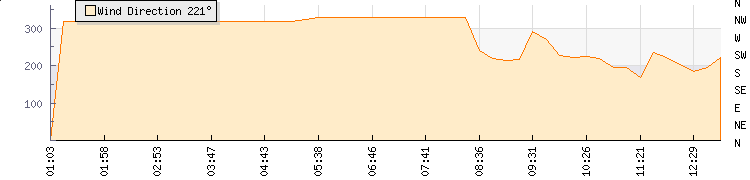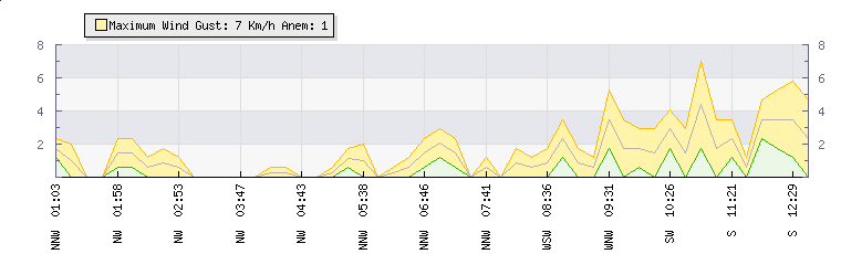 In the last few minutes the wind was South South West at an average speed of 4 kmh, reaching up to 7 kmh and a low of 2 kmh. The gust strength is5 kmh above the minimum speed |