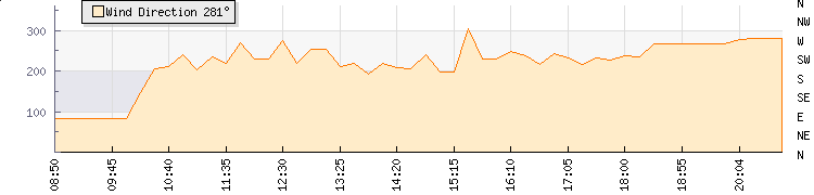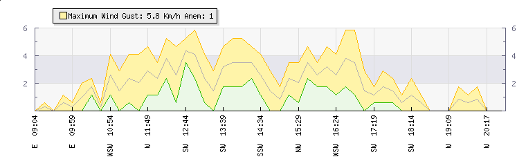 In the last few minutes the wind was Westerly at an average speed of 1 kmh, reaching up to 2 kmh and a low of 0 kmh. The gust strength is2 kmh above the minimum speed |