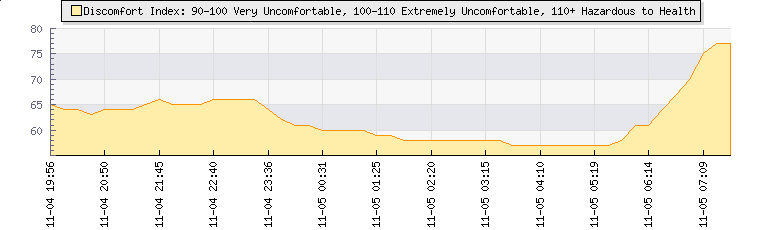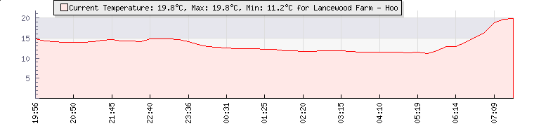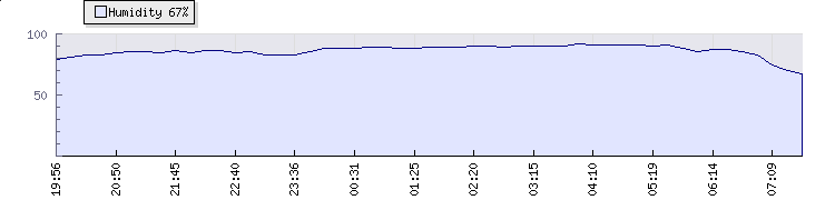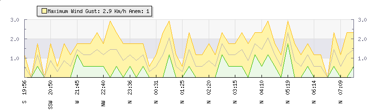 | Wind Gust: | 3 km/h | Min Temp: | 11.4 °C | Max Temp: | 12.7 °C | | Wind Average: | 2 km/h | Min Hum: | 88 % | Max Hum: | 91 % | |  |