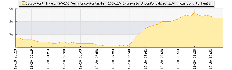| Wind Speed: | 2|4|6 kmh | Wind Direction: | ESE 113° | Temperature: | 24°C | | Wet Bulb: | 16.9°C | Discomfort: | 84 | Humidity: | 48% | | Rainfall Today: | 0mm | 12 hrs Rainfall: | 0mm | 24 hrs Rainfall: | 0mm | | Barometer: | 1017mb | Dew Point: | 12.3°C | Clouds AGL: | 4680ft (1426 m) | | Density-Alt: | 1982ft (604 m) | Solar Radiation: | 1274Wm² | Fire Danger: | |