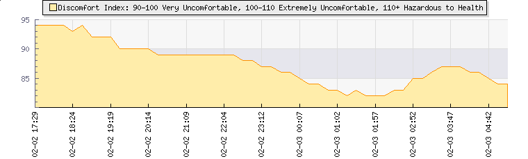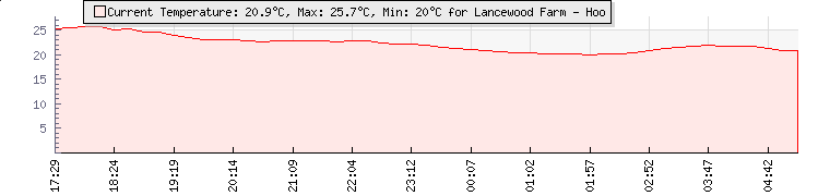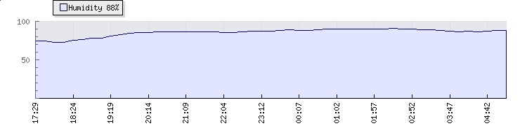 | Wind Gust: | 1 km/h | Min Temp: | 20 °C | Max Temp: | 22 °C | | Wind Average: | 1 km/h | Min Hum: | 87 % | Max Hum: | 91 % | |  |