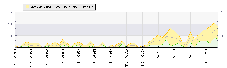 In the last few minutes the wind was East South East at an average speed of 4 kmh, reaching up to 6 kmh and a low of 2 kmh. The gust strength is4 kmh above the minimum speed |