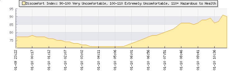 | Wind Speed: | 0|1|1 kmh | Wind Direction: | ESE 102° | Temperature: | 18°C | | Wet Bulb: | 16.4°C | Discomfort: | 76 | Humidity: | 87% | | Rainfall Today: | 0mm | 12 hrs Rainfall: | 0mm | 24 hrs Rainfall: | 1.9mm | | Barometer: | 1020.7mb | Dew Point: | 15.8°C | Clouds AGL: | 879ft (268 m) | | Density-Alt: | 1207ft (368 m) | Fire Danger: | |