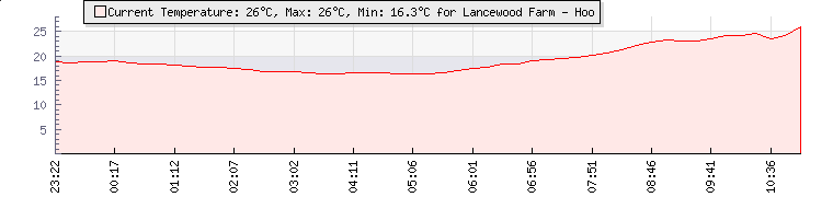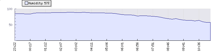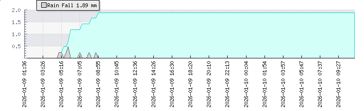 | Wind Gust: | 5 km/h | Min Temp: | 18 °C | Max Temp: | 18.9 °C | | Wind Average: | 4 km/h | Min Hum: | 84 % | Max Hum: | 88 % | |  |