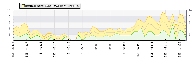 In the last few minutes the wind was East South East at an average speed of 1 kmh, reaching up to 1 kmh and a low of 0 kmh. The gust strength is1 kmh above the minimum speed |