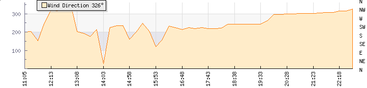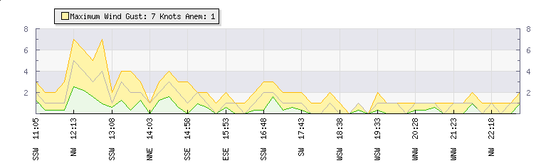 In the last few minutes the wind was West North West at an average speed of 1 knots, reaching up to 1 knots and a low of 0 knots. The gust strength is1 knots above the minimum speed |