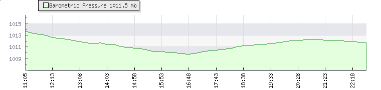 Wind Speed: | 0|1|1 knots | Wind Direction: | WNW 296° | Temperature: | 21.7°C | Wet Bulb: | 15.3°C | Discomfort: | 78 | Humidity: | 51% | Rainfall Today: | 0mm | 12 hrs Rainfall: | 0mm | 24 hrs Rainfall: | 0mm | Barometer: | 1011.9mb | Dew Point: | 11.1°C | Clouds AGL: | 4235ft (1291 m) | Density-Alt: | 1877ft (572 m) | Fire Danger: | |