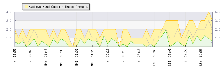 | Wind Gust: | 3 knots | Min Temp: | 10.4 °C | Max Temp: | 22.4 °C | | Wind Average: | 2 knots | Min Hum: | 54 % | Max Hum: | 90 % | |  |