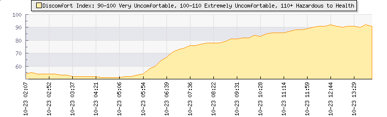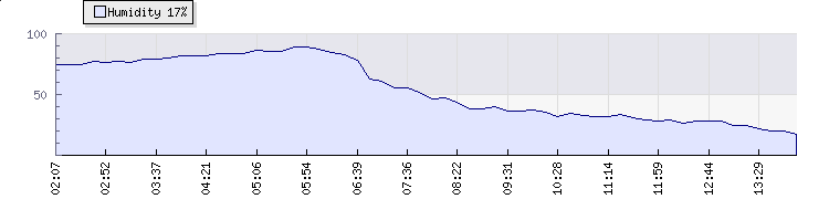 Wind Gust: | 6 km/h | Min Temp: | 9.4 °C | Max Temp: | 23.8 °C | Wind Average: | 3 km/h | Min Hum: | 38 % | Max Hum: | 89 % | |  |