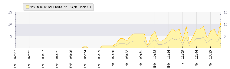In the last few minutes the wind was West North West at an average speed of 3 kmh, reaching up to 6 kmh and a low of 0 kmh. The gust strength is6 kmh above the minimum speed |