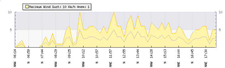 In the last few minutes the wind was North North West at an average speed of 3 kmh, reaching up to 5 kmh and a low of 0 kmh. The gust strength is5 kmh above the minimum speed |