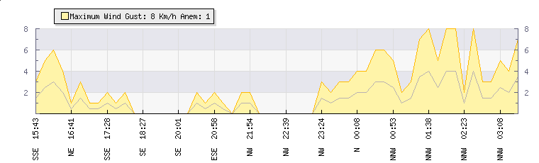In the last few minutes the wind was North North West at an average speed of 4 kmh, reaching up to 8 kmh and a low of 0 kmh. The gust strength is8 kmh above the minimum speed |