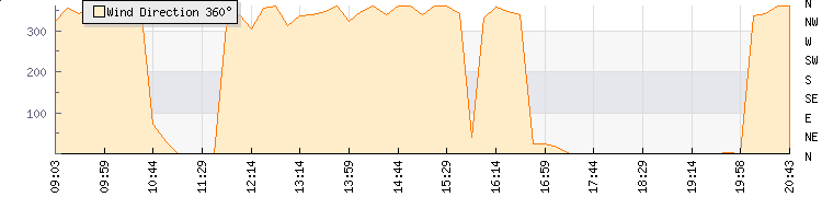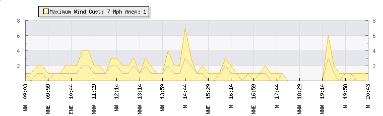 In the last few minutes the wind was North North West at an average speed of 0 mph, reaching up to 0 mph and a low of 0 mph. The gust strength is0 mph above the minimum speed |