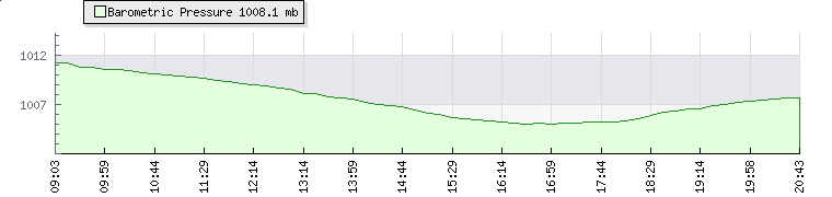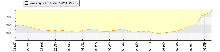 | Wind Speed: | 0|0|0 mph | Wind Direction: | NNW 342° | Temperature: | 24.3°C | | Wet Bulb: | 20.1°C | Discomfort: | 89 | Humidity: | 69% | | Rainfall Today: | 0mm | 12 hrs Rainfall: | 0mm | 24 hrs Rainfall: | 3.3mm | | Barometer: | 1007mb | Dew Point: | 18.2°C | Clouds AGL: | 2424ft (739 m) | | Density-Alt: | 1542ft (470 m) | Fire Danger: | |