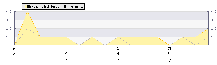 In the last few minutes the wind was Northerly at an average speed of 1 mph, reaching up to 2 mph and a low of 0 mph. The gust strength is2 mph above the minimum speed |
