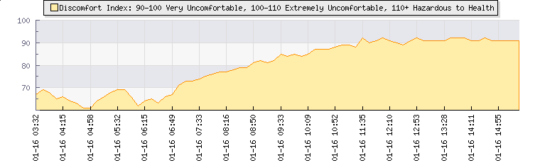 | Wind Speed: | 0|7|14 kmh | Wind Direction: | ESE 116° | Temperature: | 27.6°C | | Wet Bulb: | 19.1°C | Discomfort: | 91 | Humidity: | 43% | | Rainfall Today: | 0mm | 12 hrs Rainfall: | 0mm | 24 hrs Rainfall: | 0mm | | Barometer: | 1006mb | Dew Point: | 13.9°C | Clouds AGL: | 5490ft (1673 m) | | Density-Alt: | 2198ft (670 m) | Fire Danger: | |