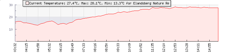 | Wind Gust: | 41 km/h | Min Temp: | 13.3 °C | Max Temp: | 28.1 °C | | Wind Average: | 21 km/h | Min Hum: | 41 % | Max Hum: | 77 % | |  |