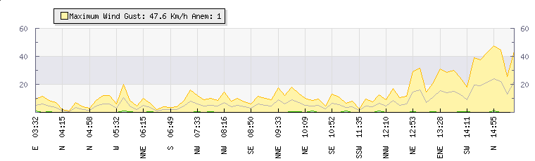In the last few minutes the wind was East South East at an average speed of 7 kmh, reaching up to 14 kmh and a low of 0 kmh. The gust strength is14 kmh above the minimum speed |
