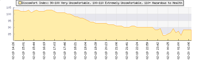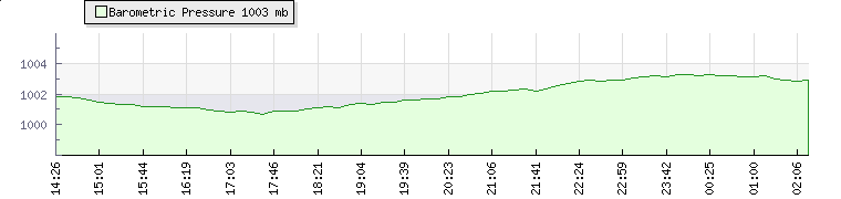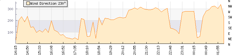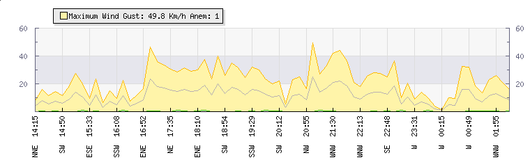 | Wind Gust: | 10 km/h | Min Temp: | 22.7 °C | Max Temp: | 23.2 °C | | Wind Average: | 5 km/h | Min Hum: | 65 % | Max Hum: | 66 % | |  |