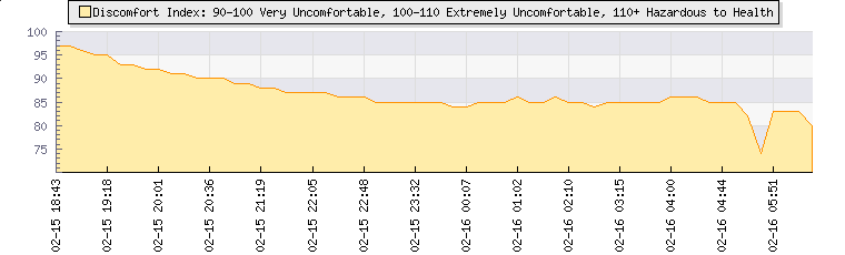 | Wind Speed: | 0|11|21 knots | Wind Direction: | E 100° | Temperature: | 25.7°C | | Wet Bulb: | 16.8°C | Discomfort: | 85 | Humidity: | 39% | | Rainfall Today: | 0mm | 12 hrs Rainfall: | 0mm | 24 hrs Rainfall: | 0mm | | Barometer: | 1003.8mb | Dew Point: | 10.7°C | Clouds AGL: | 6004ft (1830 m) | | Density-Alt: | 2018ft (615 m) | Fire Danger: | |