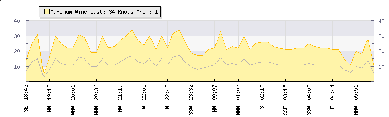 | Wind Gust: | 33 knots | Min Temp: | 24.3 °C | Max Temp: | 26.1 °C | | Wind Average: | 16 knots | Min Hum: | 39 % | Max Hum: | 51 % | |  |