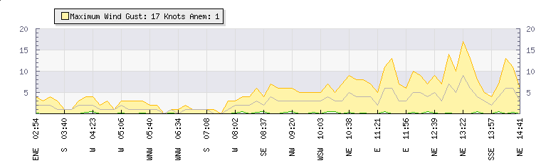 | Wind Gust: | 14 knots | Min Temp: | 11.8 °C | Max Temp: | 24.2 °C | | Wind Average: | 7 knots | Min Hum: | 46 % | Max Hum: | 91 % | |  |