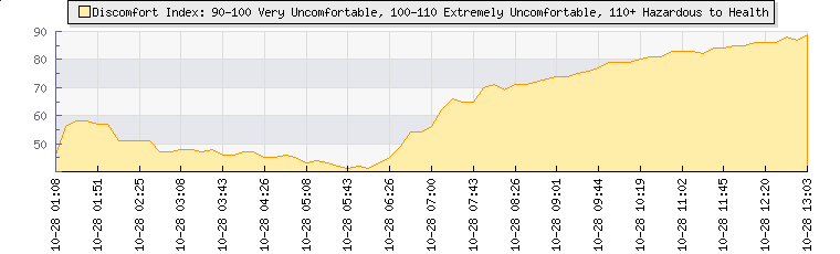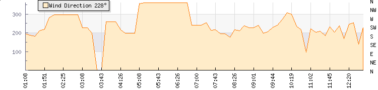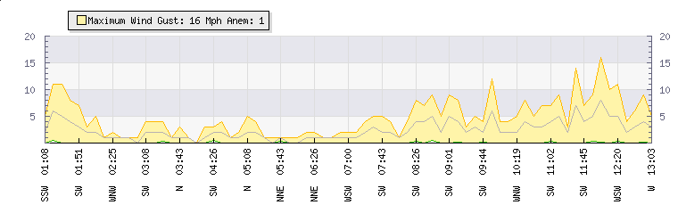 | Wind Gust: | 11 mph | Min Temp: | 7.8 °C | Max Temp: | 12 °C | | Wind Average: | 6 mph | Min Hum: | 84 % | Max Hum: | 87 % | |  |