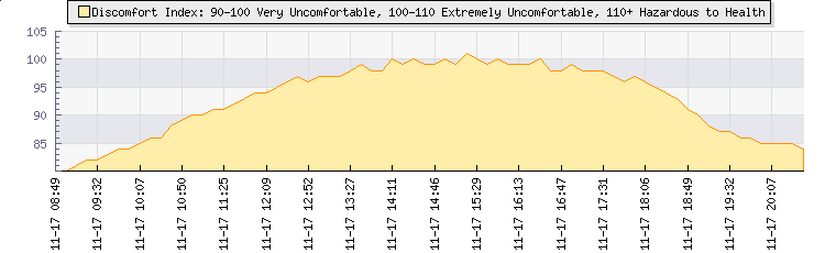 | Wind Speed: | 0|4|8 mph | Wind Direction: | N 11° | Temperature: | 30.7°C | | Wet Bulb: | 18.4°C | Discomfort: | 94 | Humidity: | 28% | | Rainfall Today: | 0mm | 12 hrs Rainfall: | 0mm | 24 hrs Rainfall: | 0mm | | Barometer: | 1005.3mb | Dew Point: | 10.1°C | Clouds AGL: | 8249ft (2514 m) | | Density-Alt: | 2516ft (767 m) | Fire Danger: | |