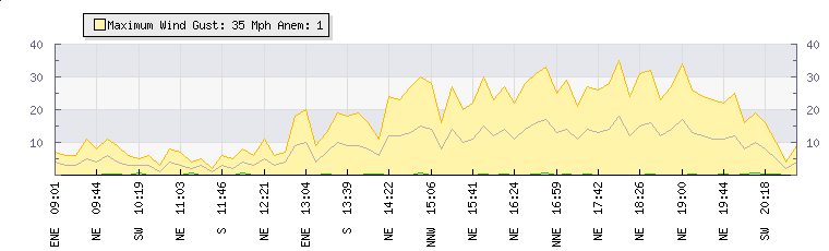 | Wind Gust: | 35 mph | Min Temp: | 13.3 °C | Max Temp: | 28.1 °C | | Wind Average: | 17 mph | Min Hum: | 41 % | Max Hum: | 77 % | |  |