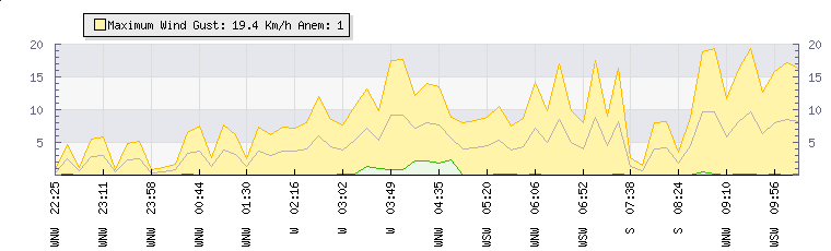 In the last few minutes the wind was West South West at an average speed of 10 kmh, reaching up to 19 kmh and a low of 0 kmh. The gust strength is19 kmh above the minimum speed |