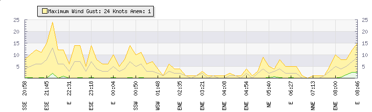 In the last few minutes the wind was North Easterly at an average speed of 4 knots, reaching up to 9 knots and a low of 0 knots. The gust strength is9 knots above the minimum speed |