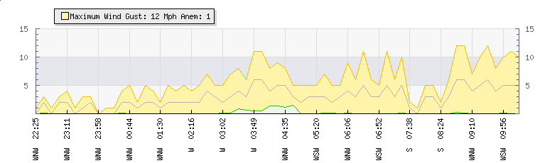 In the last few minutes the wind was West South West at an average speed of 6 mph, reaching up to 12 mph and a low of 0 mph. The gust strength is12 mph above the minimum speed |