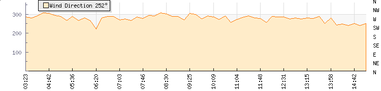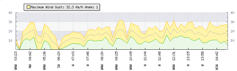 In the last few minutes the wind was Westerly at an average speed of 14 kmh, reaching up to 20 kmh and a low of 8 kmh. The gust strength is12 kmh above the minimum speed |